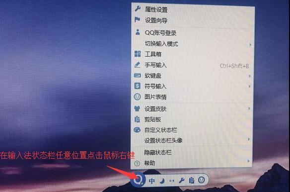 2、再把鼠标光标放在QQ拼音输入法状态栏里面的任意位置,然后单击鼠标右键;