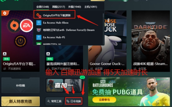 1、打开迅游加速器,找到EA进行加速,非常方便的是迅游加速EA平台是免费的,不过大家依旧可以在口令兑换处输入白嫖迅游加速,得5天的时长。