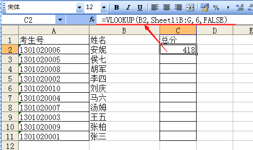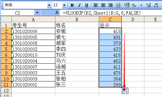 如图,要把上图(sheet1)中G列总分复制到下图(sheet2)的C列。