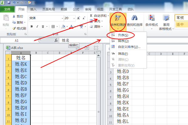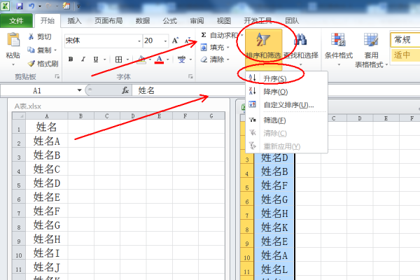 1、打开需要操作的EXCEL表格A,选中相关姓名单元格,点击开始选项卡中的【排序和筛选】-【升序】。