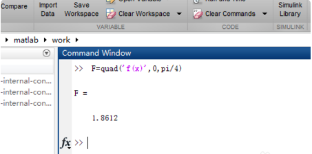 5、调用积分函数squad进行计算。输入指令: F=quad('f(x)',0,pi/4),如图,回车后可得到计算结果1.8612。其他函数,只要修改函数文件中的表达式即可。
