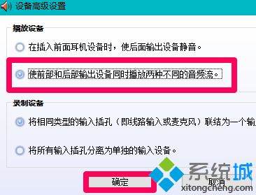 7、我们更改播放设备的选项为:使前部和后部输出设备同时播放两种不同的音频流,再点击:确定;