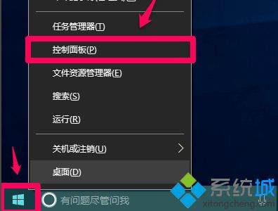 3、右键点击系统桌面左下角的【开始】,在开始菜单中点击【控制面板】;