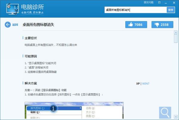 然后打开电脑管家——电脑诊所——右上角搜索【桌面所有图标都消失】