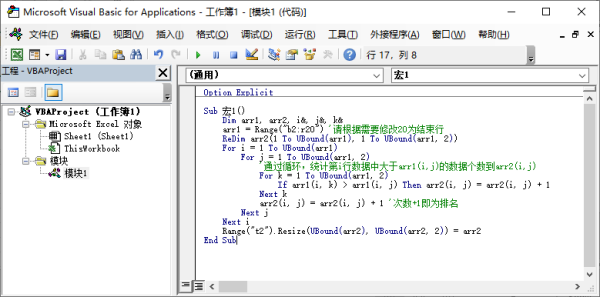 假定是成绩。则用字典1,成绩作为key,取得不重复成绩列表 然后,把字典1的keys进行排序后,从大小到依序装入另一字典2。仍然用成绩作为key,item为自然数序列 遍历原始数据,根据成绩从字典2中读得对应名次怎样用VBA实现中国式排名
