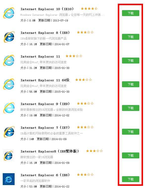 3.在结果中分别找到各个版本的IE下载,如图所示