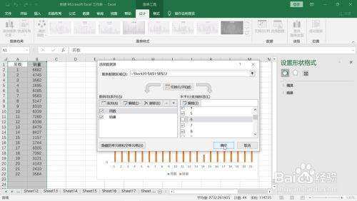 在弹出来的选择数据源对话框中,点击”周数“,在它右边的选框中点击取消“6”前面的勾,鼠标移动到下方,点击“确定”,修改后的柱形图如下图所示。