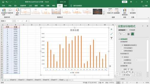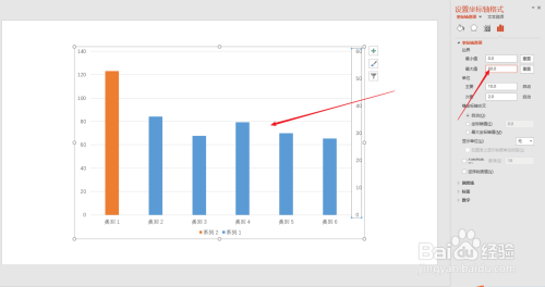 但是仍然要体现异常数据特别大这个现实。双击正常数据所在的纵坐标轴,在右侧自动打开设置窗口,增大坐标轴最大值,使得柱形稍矮。