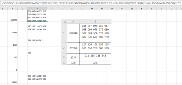 where A.职员 order byA.职员,B.职员,C.职员 点击确定。 8、稍微等待一下,系统会把满足条件所用排列组合显示出来。 9、最后选择Query"文件"菜单下"将数据返回到EXCEL"选项。 10、弹出"导入数据"对话框,鼠标单击D1单元格,确认数据导入在D1单元格,确定,当然也可以把结果放在新工作表中。 11、因为全排列的数据量很大,有969种排列组合,把EXCEL表进行了窗口冻结操作。 12、后续对结果进行处理,打印出抽签条即可。 2019ORWPS =TEXTJOIN("",1,IF(ISNUMBER(SEARCH(TEXT(ROW($1:$789),"0!*0!*0"),CONCAT(SMALL(MOD(9&MID(A1,ROW($1:$9),1),10),ROW(INDIRECT("1:"&LEN(A1))))))),TEXT(ROW($1:$789),"000"),"")) 验证无误 公式解决方案: H1=1 I1=2 J1=3 H2 =IF(((I1+1)>4)*((J1+1)>5),H1+1,H1) I2 =IF(IF((J1+1)>5,I1+1,I1)>4,H2+1,IF((J1+1)>5,I1+1,I1)) J2 =IF(J1+1>5,I2+1,J1+1) 选定H2:J2 下拉至第10行 K1 =INDIRECT("R1C"&H1,FALSE)*100+INDIRECT("R1C"&I1,FALSE)*10+INDIRECT("R1C"&J1,FALSE) 下拉至K10 K列即所求的。 VBA解决方案: 在工作表插入一命令按钮,并编程如下: PrivateSubCommandButton1_Click() l=1 Fori1=1To3 Fori2=i1+1To4 Fori3=i2+1To5 Range("F"&l)=Cells(1,i1)*100+Cells(1,i2)*10+Cells(1,i3) l=l+1 Nexti3 Nexti2 Nexti1 EndSub 运行结果: 解题思路: 26个大写字母连续三个组合有108个组合,如ABC,BCD等,不重复有组合有1560个 在数据每行里找出是否有连续的三个,有列出有多少个组合,每行组合是。 然后再把每行行组合排出不重复的组合, 列出不重复组在每行是否存在,计出个数。 得出三个不重组合和个数排序,最多在前,然后输出。 要用VBA处理才快速算出。 公式不能一步到位,要分步处理。 Excel怎样处理复杂公式(分步处理法) 之牛牛的玩法求Excel公式