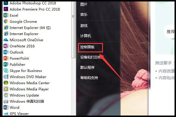 1、在系统中点击控制面板选项卡进入控制面板界面。