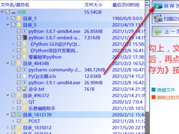 3、扫描完成后文件夹名变《目录+数字》,没关系这是最外层的根目录被破坏导致的,里面的文件名都是正常的。将需要恢复的数据打钩,然后点右上角的保存,《另存为》按钮,将打钩的文件复制出来。