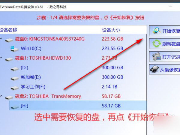 1、先下载并解压程序打开后,选中需要恢复的盘,然后点《开始恢复》按钮。