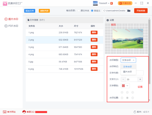 步骤3,然后进行水印的设置,软件支持文字水印和logo水印两种方式,根据自己的实际需求选择,然后再设置水印的相关参数(如:大小、颜色、透明度、大小比例、位置等参数),在上方可实时预览水印的样子。