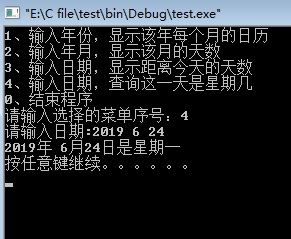 printf("%4d年%2d月%2d日是%s\n按任意键继续。。。。。。\n",year,month,day,getStrWeek(yx,mx,day)),getch();