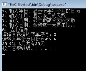 日历实现翻页功能,按键盘左右方向键可以翻译查看当年其他月份,按向上方向键可以返回菜单。