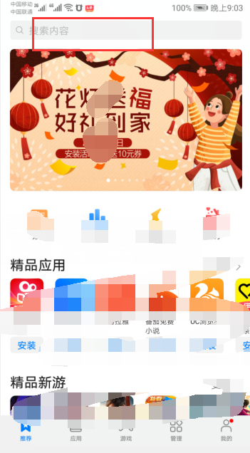 2、在打开的应用市场中,点击搜索栏的位置。