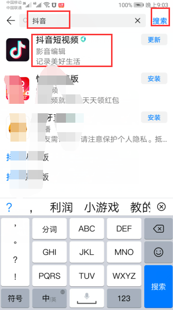 3、在搜索框中输入“抖音”,点击后面的“搜索”按钮,然后点击“抖音短视频”,进行安装和下载。
