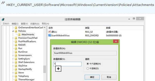 如果找不到Attachments子键,可以自己手动新建一个,右击新建一个Attachments项,再在Attachments项下新建一个DWORD (32-位)值为ScanWithAntiVirus并设置其值为1即可。