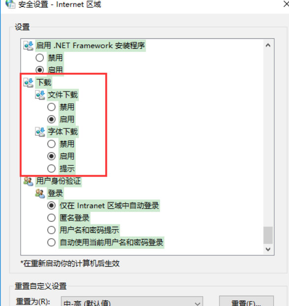运行inetcpl.cpl——在Internet 属性中——选择安全选项卡——选中Internet——点击自定义级别——将文件下载设置为启用