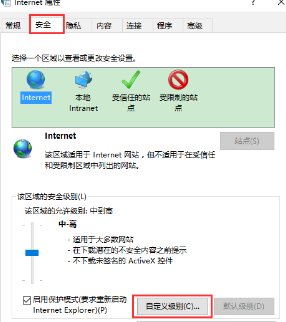 3、进入internet属性界面,然后选项卡切换至“安全”,然后再点击“自定义级别”按钮。