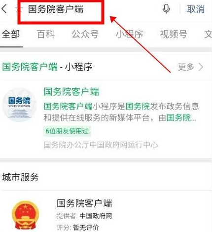 1、首先打开微信,进入到搜索界面,在搜索框中输入“国务院客户端”,点击并进入到小程序中。