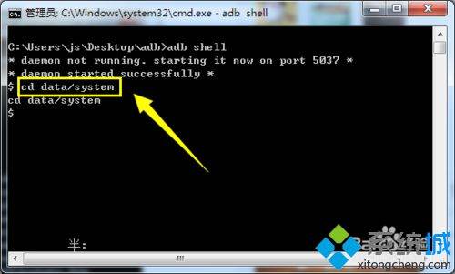 5、接着执行“cd data/system”命令,以便进入平板系统“data/system”目录,如图所示: