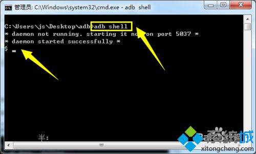 4、在打开的“ADB”界面中,输入“adb shell”命令进入shell控制台界面。如图所示: