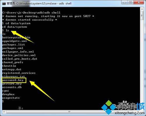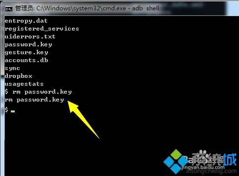 7、我们只需要将此文件删除,即可实现清除平板锁屏密码操作。执行命令“rmpassword.key"命令即可。
