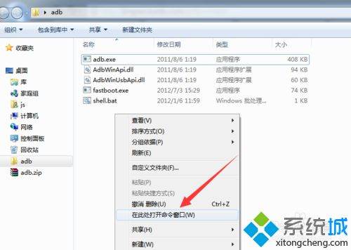 3、将平板和电脑通过USB数据线进行连接,确保平板驱动正常安装的情况下,进入ADB目录,在按住键盘“Shift”键的同时,右击目录空白处,选择“在此处打开命令窗口”项。