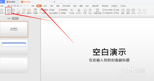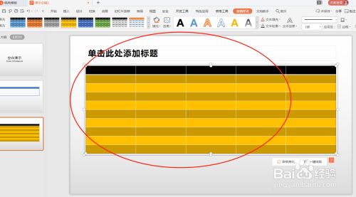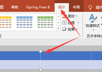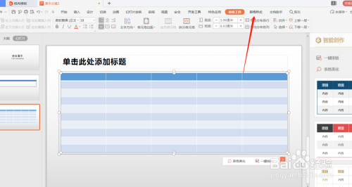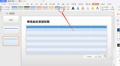 1、打开WPS演示,点击选中插入的表格,工具栏跳转到表格“设计”选项中。
