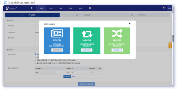 支持固定试卷、抽题试卷、随机试卷三种试卷类型。