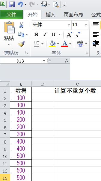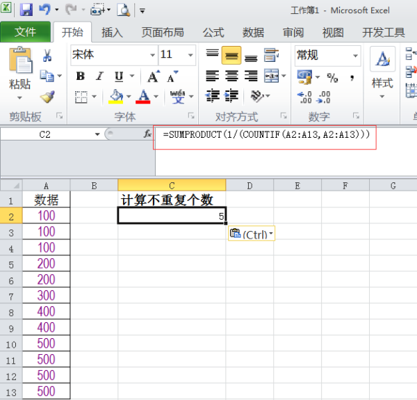 在C2单元格中输入公式=sumproduct(1/(COUNTIF(A2:A13,A2:A13))),回车键结束,得到结果5.