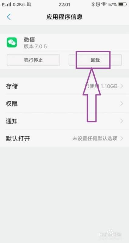 应用程序数据清除完毕后,返回应用程序的信息页面,点击页面上的卸载,将应用程序从手机上卸载掉。卸载完毕后,打开手机的应用商城,在商城中搜索下载并安装最新版微信应用程序,应该就可以解决问题了。