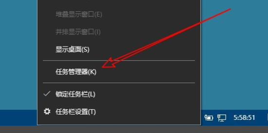 4、右键点击任务栏的空白位置,在弹出菜单中选择选择“任务管理器”菜单项。
