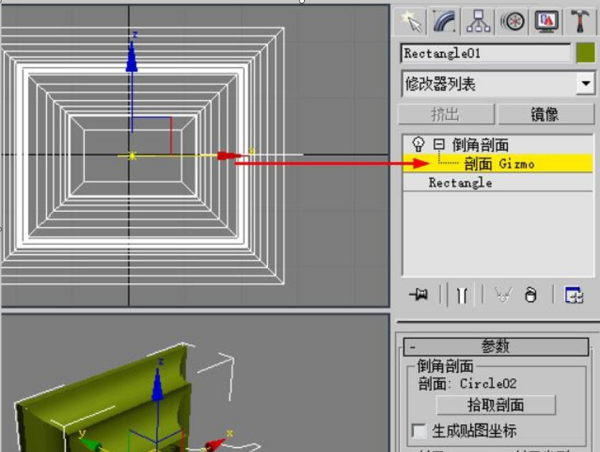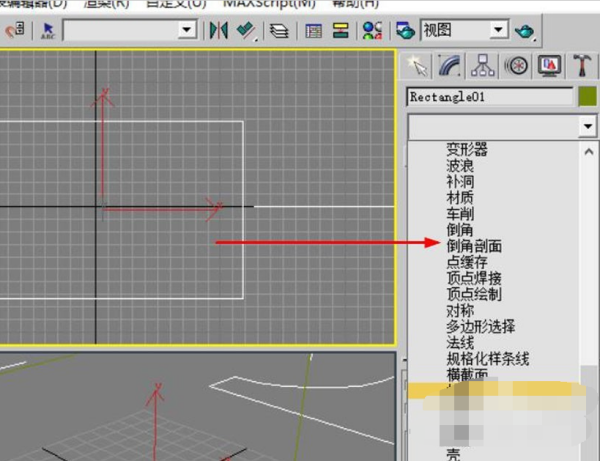 10、回到前视图,选择先前绘制的矩形。然后选择修改器里的倒角剖面。
