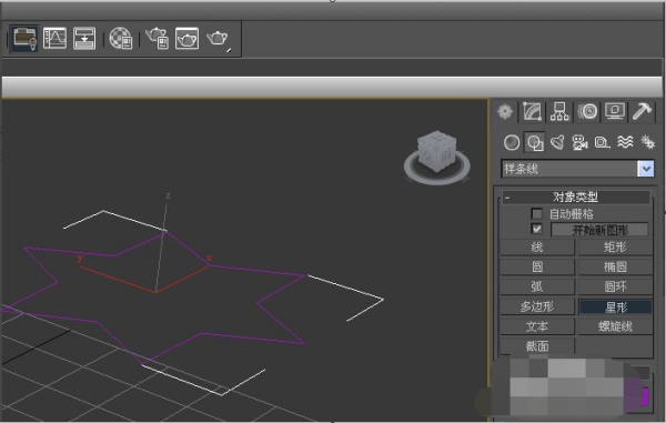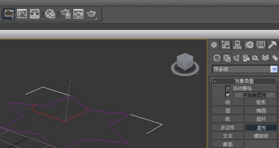 1、打开3D Max软件。可以看到四个视窗。在窗口的右侧,用鼠标左键单击面板的样条线按钮,选择星形,在透视图上拖动并绘制星形线,然后将颜色更改为粉色,如下图所示。
