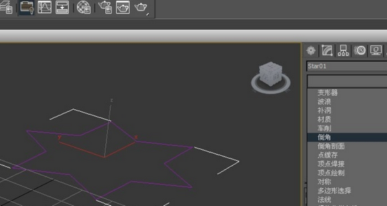 2、接着鼠标左键选择【星形】后,在右边的【修改器】面板上,拖动下拉选项,选择倒角命令