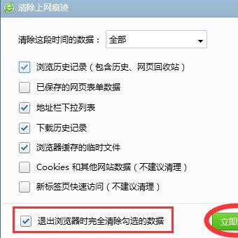 根据需要打勾后,在下方“退出浏览器时完全清除勾选的数据”前打勾,再按“确定”即可,如下图;