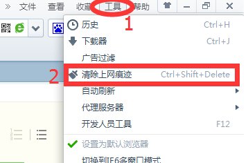打开浏览器,选择工具——清除上网痕迹,如下图;