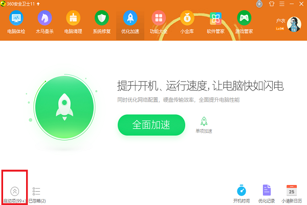 3、在“优化加速”选项界面中左下方位置有“启动项”选项,点击“启动项”选项进入启动项设置。