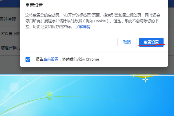 5.单击“重置设置”,以便将Chrome浏览器恢复到其初始状态,并修复错误。