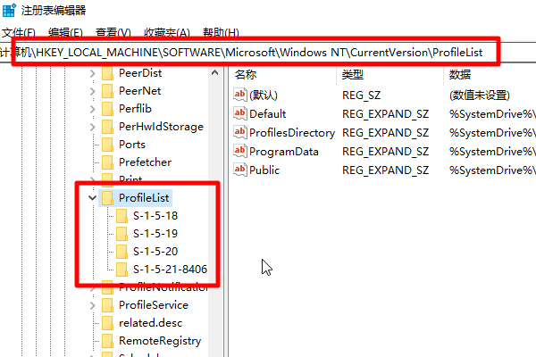 3,在“注册表编辑器”中,找到:HKEY_LOCAL_MACHINE\SOFTWARE\Microsoft\Windows NT\CurrentVersion\ProfileList项,并在左窗格中找到以“S-1-5”(SID 密钥)开头,后跟一长串数字的文件夹(数字是随机的)。