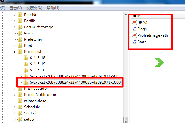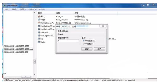 并在此项的右侧,新建一个DWORD值,名为Flags值为0;一个字符串值,名为ProfileImagePath,值为C:\Users\user1;一个DWORD值,名为State值为0(以上都要注意大小写一致);