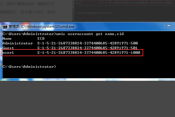 8、打开命令提示符CMD窗口,运行wmic useraccount get name,sid,在结果中找到user1与对应的SID,将SID复制出来(复制的方法是:右键选择标记、选中整个SID、再右键即可);