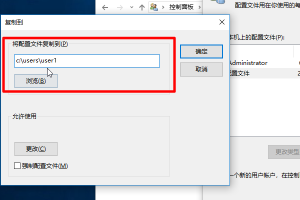 7、点击浏览,选择C:\Users\user1,点击“确定”;