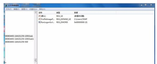 4,在这里大家可以看到两个带有一长串数字的文件夹,除去末尾的“.bak”外文件夹名称的其他部分完全相同,分别查看这两个文件夹在右窗格中“ProfileImagePath”的数据,无“.bak”的文件夹,其数据为“C:\Users\TEMP”。而以“.bak”结尾的文件夹,其数据为“C:\Users\账户名称”,将这两个文件夹的名称互换,将带有“.bak”的文件夹去掉“.bak”更改为正常文件夹,将原本没有“.bak”的文件夹加上“.bak”(重命名方法:右键单击文件夹,选择“重命名”)。