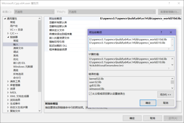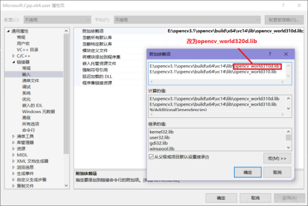 2、配置附加依赖项的时候,把版本号改为opencv_world320d.lib,就可以了。