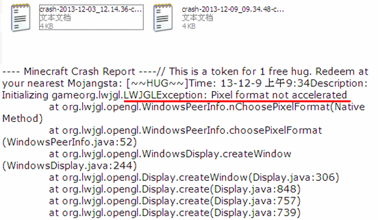 这种常见错误报告一般是较早版本的(1.5.2及之前版本。从1.6开始不再出现这个界面,而是生成包含LWJGLException:Pixel format not accelerated的错误报告,上文已提到。)