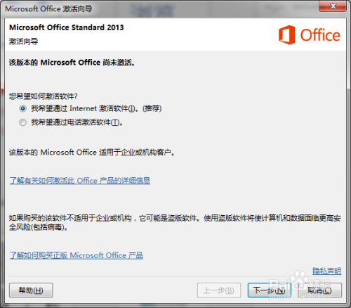 如果office软件已经过期,就会出现如下的提示窗,需要输入激活码,而激活码是需要购买的。或者通过电话等方式进行激活。