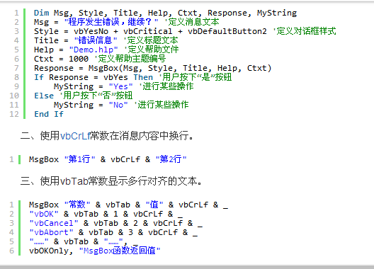 语法:MsgBox(prompt[, buttons] [, title] [, helpfile, context])
